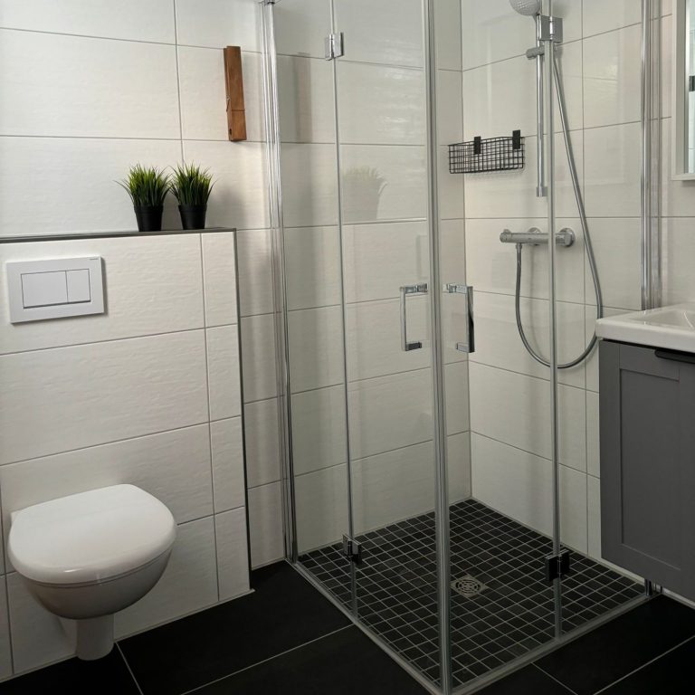 Das ebenerdige Badezimmer bietet Ihnen einen modernen und barrierefreien Komfort. Es verfügt über ein WC, das optimal in das Raumkonzept integriert ist. Die bodengleiche Dusche ermöglicht einen bequemen Zugang und sorgt für ein angenehmes Duscherlebnis, während das hübsche Waschbecken ausreichend Platz für Ihre persönlichen Pflegeartikel bietet. Dank des Fensters genießt das Badezimmer Tageslicht, das eine helle und freundliche Atmosphäre schafft. Hier finden Sie den idealen Raum zur Entspannung und Erfrischung während Ihres Aufenthalts.